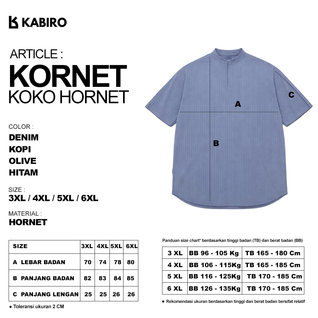 Kornet KABIRO adalah koko kasual elastis yang dirancang khusus untuk Anda yang bertubuh besar namun tetap ingin tampil rapi, santai, dan islami. Didesain dengan kerah koko (shanghai), lengan pendek, dua kantong samping, serta satu kancing pengait di bagian leher. Potongannya dibuat lebih longgar, proporsional, dan cukup panjang nyaman dipakai bergerak maupun beribadah.